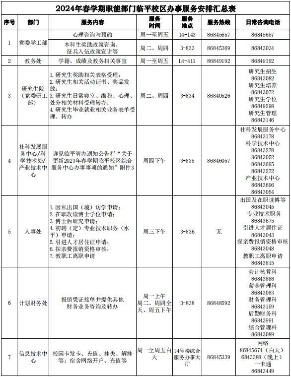 为更好地服务师生办事,提高办事效率,现发布2024年春学期职能部门在临平校区办事服务安排(见下图)。