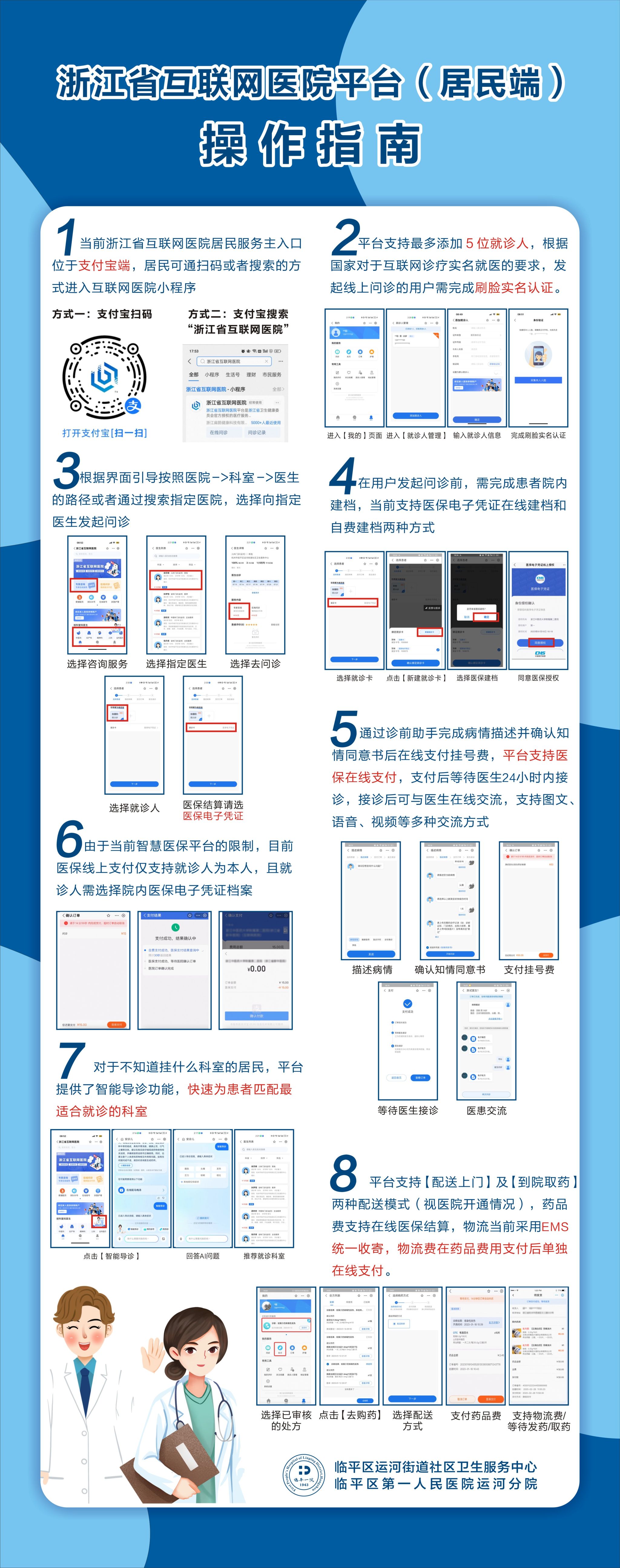 目前浙江省人民医院、浙大一院、浙大二院、邵逸夫医院、浙江省中医院、杭州市第一人民医院、临平区第一人民医院等医院都已入驻该平台。在支付宝搜索“浙江省互联网医院”进入小程序,再搜“杭州市临平区运河街道社区卫生服务中心”选择医生;或直接扫医生的二维码发起问诊。